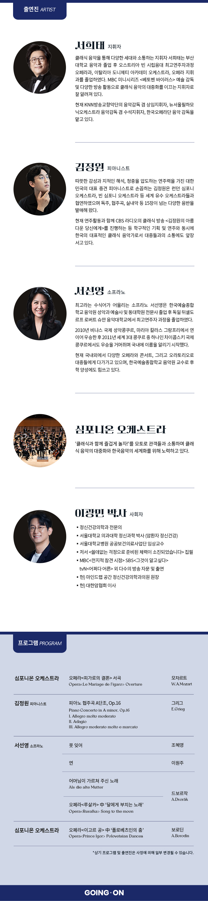 지연 관객 입장 시에는 예매하신 좌석에서 관람이 어려울 수 있으며, 다른 관람객의 관람에 방해되지 않도록 안내원의 유도에 따라주시기 바랍니다. - 악장과 악장 사이의 박수는 곡의 흐름을 방해하니, 한 곡이 모두 끝나고 열렬한 환호와 박수를 부탁드립니다.