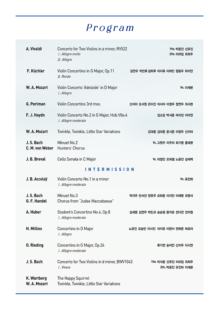 지연 관객 입장 시에는 예매하신 좌석에서 관람이 어려울 수 있으며, 다른 관람객의 관람에 방해되지 않도록 안내원의 유도에 따라주시기 바랍니다. - 악장과 악장 사이의 박수는 곡의 흐름을 방해하니, 한 곡이 모두 끝나고 열렬한 환호와 박수를 부탁드립니다.