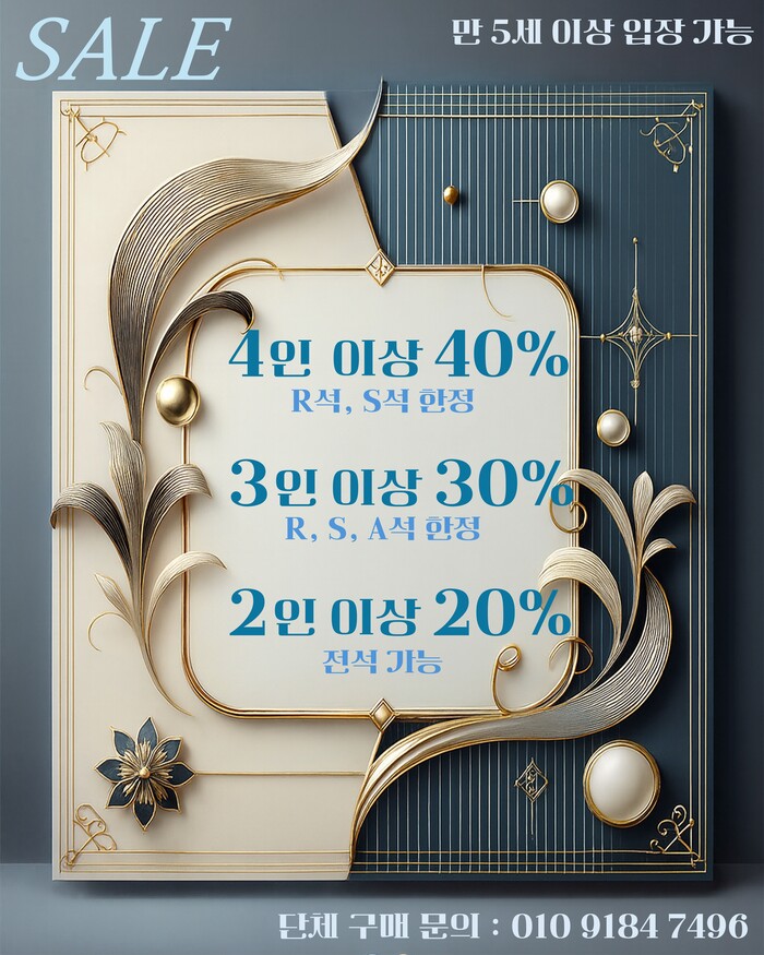 4매 이상 예매 시 40% 할인 (R석, S석에 한해 4매 이상 예매 시 적용 / 부분취소 불가)