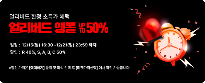얼리버드 할인(1인 4매) R석 40% / S, A, B, C석 50% (12.12(금) ~ 12.14(일)까지 예매 시 적용 / 할인 기간 이후 예매, 좌석 변경 불가)