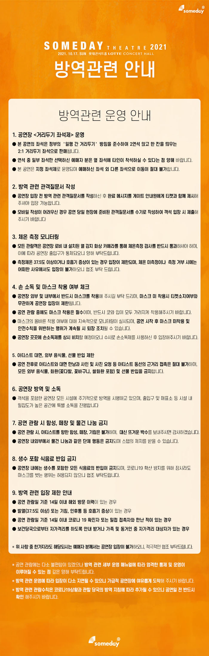※ 체온측정 및 문진표 작성 등 방역 관련 운영 매뉴얼에 따라 소요될 시간을 감안하여 가급적 공연장에 여유롭게 도착해주시길 바랍니다.