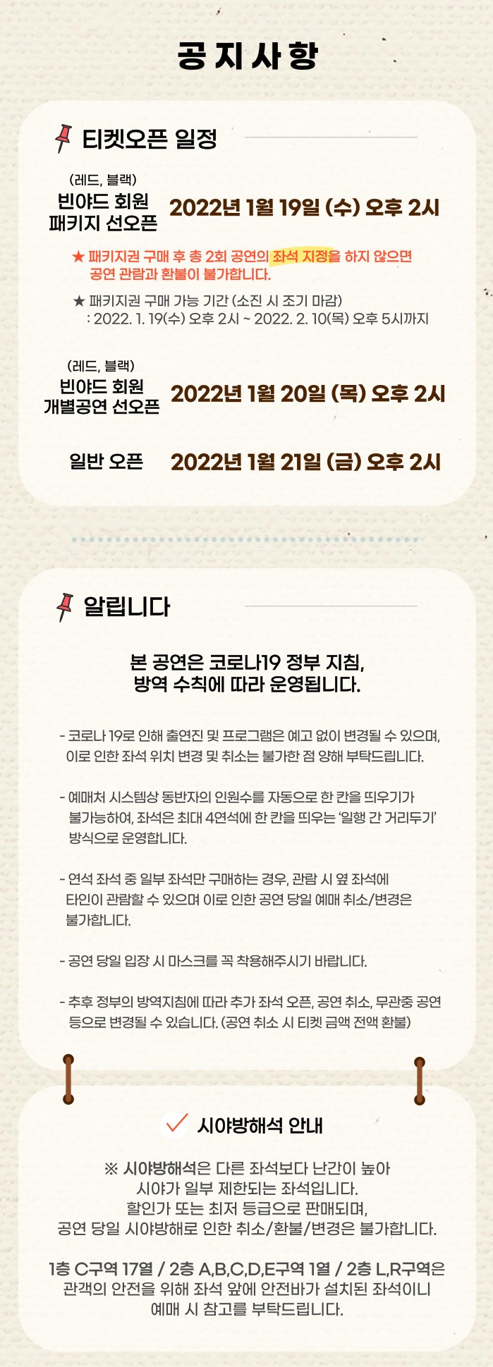 코로나19로 인한 불가피한 변수 발생 시 변경되는 내용은 본 페이지에 가장 먼저 공지될 예정이니 예매 전 참고를 부탁드립니다.