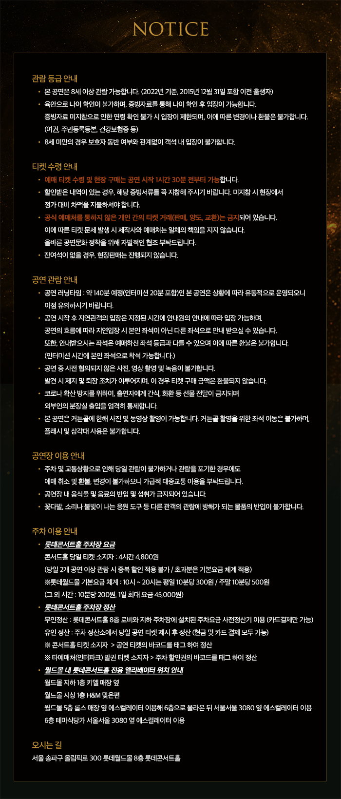 (단, 시각장애인의 안내 보조견 동반 입장은 가능합니다. 관련 문의 : 롯데콘서트홀 고객센터 1544-7744) - 공연 관람일에는 공연장 주변 교통 혼잡이 예상되오니 공연 전 여유롭게 도착해주시기를 부탁드립니다.