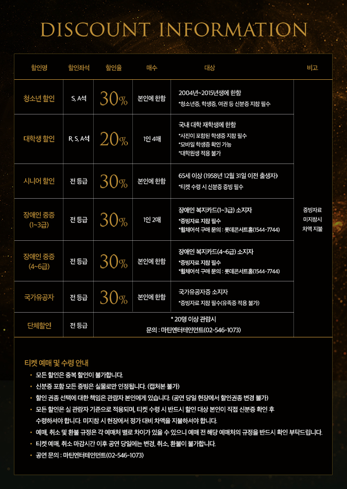 - 고객 귀책사유로 티켓 분실이나 파손이 될 경우에는 티켓은 재발행 되지 않으며, 공연 취소 및 변경도 불가합니다.