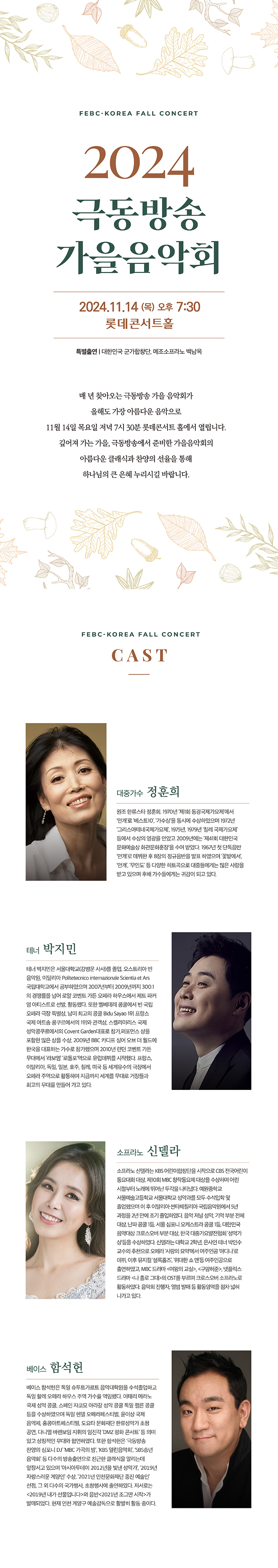 - 공연 중에는 휴대전화의 진동음도 공연 관람에 방해가 되므로 휴대전화의 전원을 반드시 꺼 주시기 바랍니다.