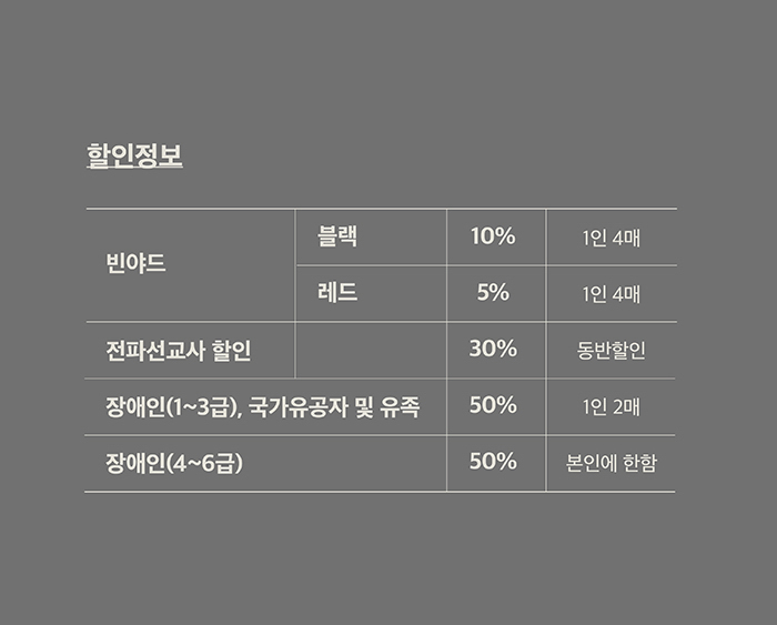 국가유공자 및 유족 50% 할인 (동반 1인 / 티켓수령 시 유공자증 혹은 유족증 확인)