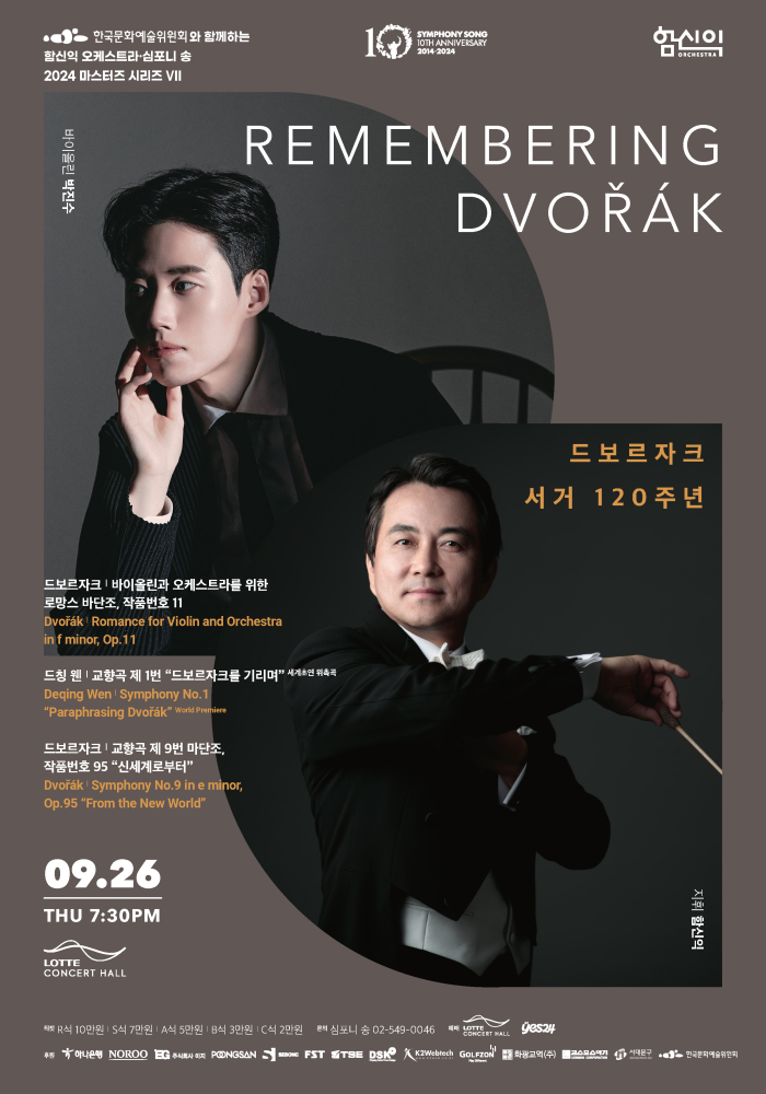 프로그램 | Deqing Wen(B. 1958) : Papraphrasing Dvorak (World Premiere) | Antonin Dvorak(1841-1904) : Romance for Violin and Orchestra in f minor, Op.11 드보르자크 : 바이올린과 오케스트라를 위한 로망스 바단조, 작품번호 11 Deqin Wen(B.1958) : Symphony No.1 "Paraphrasing Dvorak"(World Premiere) 드칭 웬 : 교향곡 제 1번 드보르자크를 기리며(세계초연 위촉곡) Antonin Dvorak(1841-1904) : Symphony No.9 in e minor, Op.95 "From the New World" 드보르자크 : 교향곡 제 9번 마단조, 작품번호 95 "신세계로부터" |