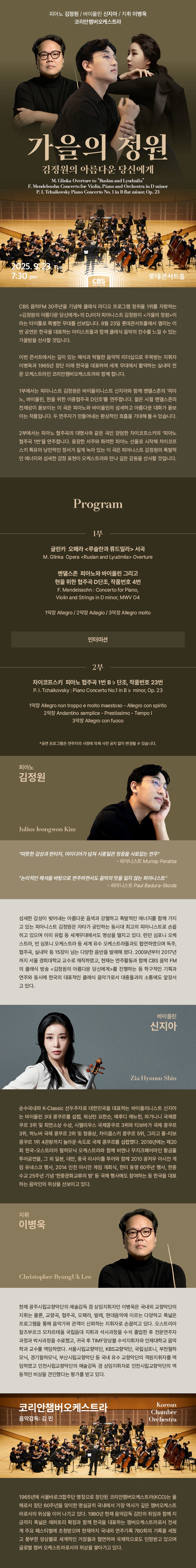 지연 관객 입장 시에는 예매하신 좌석에서 관람이 어려울 수 있으며, 다른 관람객의 관람에 방해되지 않도록 안내원의 유도에 따라주시기 바랍니다. - 악장과 악장 사이의 박수는 곡의 흐름을 방해하니, 한 곡이 모두 끝나고 열렬한 환호와 박수를 부탁드립니다.