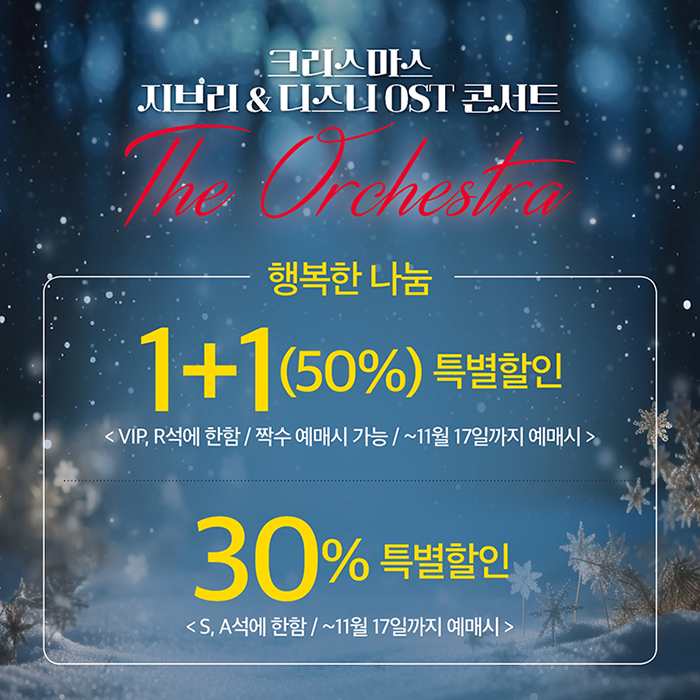 행복한 나눔 30% 특별할인 (S, A석에 한함 / ~11.17(월)까지 예매 시 / 할인 기간 이후 예매, 좌석 변경 불가)