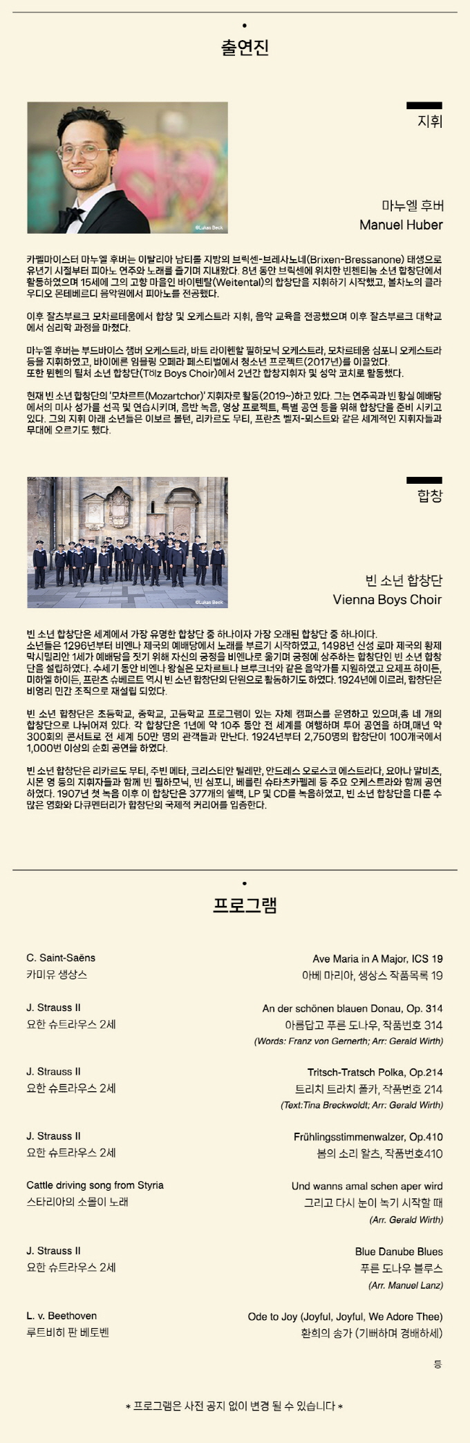 지연 관객 입장 시에는 예매하신 좌석에서 관람이 어려울 수 있으며, 다른 관람객의 관람에 방해되지 않도록 안내원의 유도에 따라주시기 바랍니다. - 악장과 악장 사이의 박수는 곡의 흐름을 방해하니, 한 곡이 모두 끝나고 열렬한 환호와 박수를 부탁드립니다.