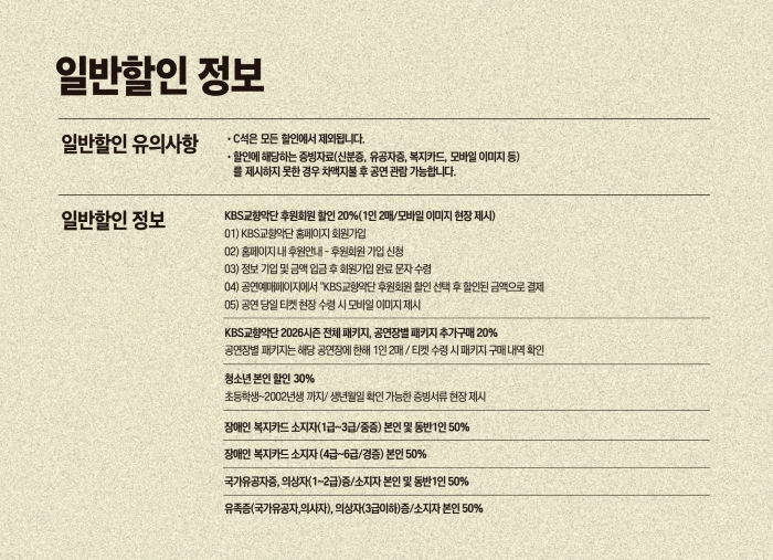 KBS교향악단 2026시즌 L패키지 예매자 추가 구매 20% (1인 2매 / 티켓 수령 시 'KBS교향악단 2026시즌 L패키지' 예매 내역 확인)
