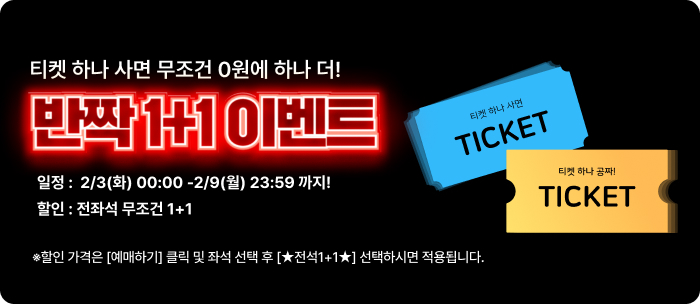 반짝 1+1 할인 (~2.2(월)까지 예매 시 적용 / R, A, B석 에 한해/ 2배수 예매 시 적용 / 부분취소 불가 / 할인 기간 이후 예매, 좌석 변경 불가)