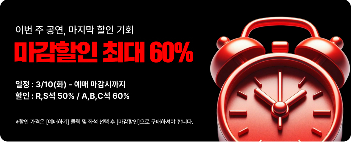마감 할인 R, S석 50% / A, B, C석 60% (1인 4매 / 3.10(화) ~ 온라인 예매 마감 시까지 적용 / 할인 기간 이후 예매, 좌석 변경 불가)